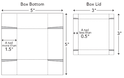 The box lid is constructed the same way. Trim a swatch down to a 3” x 3” square. At a point slightly less than 1/2” from one edge, score a line with your knife. Repeat on the remaining three sides and cut out the gray shaded sections.